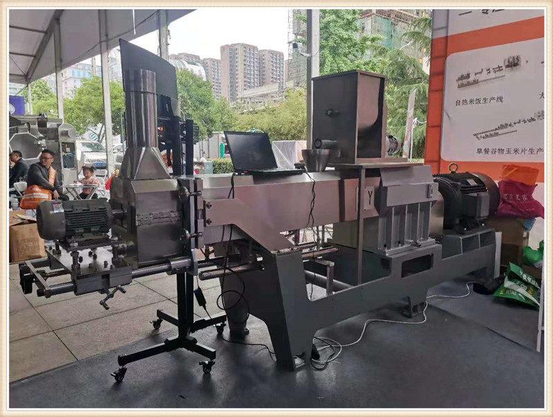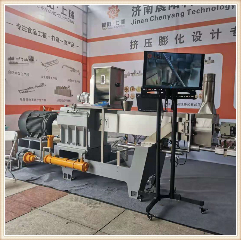 濟(jì)南晨陽公司攜帶新款CY65雙螺桿膨化主機(jī)亮相第19屆漯河食品博覽會(huì),一經(jīng)亮相,變引起了眾多膨化食品生產(chǎn)企業(yè)的關(guān)注咨詢。詳細(xì)詢問該新款機(jī)型的性能特點(diǎn),和核心產(chǎn)品加工。該款65主機(jī)搭載45kw-6級(jí)電機(jī)直連傳動(dòng),齒輪箱使用原裝南京擠出機(jī)箱體,螺桿使用分段積木組合結(jié)構(gòu),機(jī)桶使用內(nèi)壁噴涂耐磨襯套材料。機(jī)桶恒溫控制,PLC自動(dòng)控制,切割模頭升級(jí)。