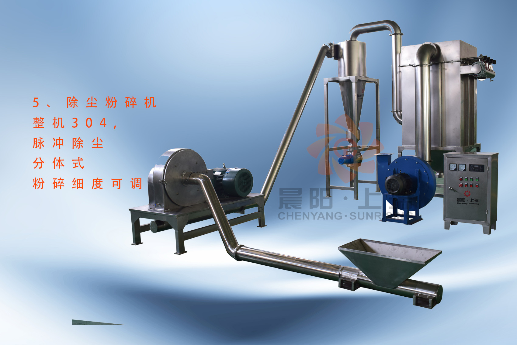 生產(chǎn)線主要設(shè)備:無塵投料站,槳葉式混合機(jī)、暫存?zhèn)}、雙螺桿膨化機(jī)、負(fù)壓輸送-干燥冷卻一體機(jī)、除塵式粉碎機(jī)、篩選機(jī)、成品倉(cāng)。